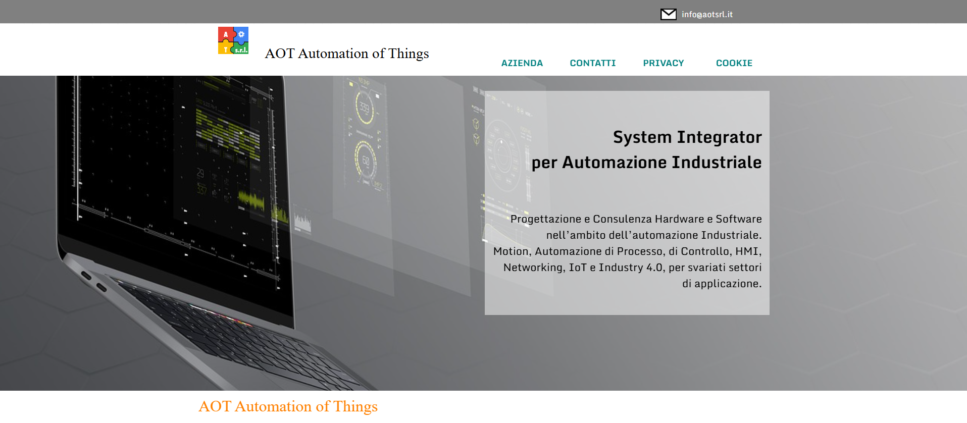 AOT S.r.l. è un sito web per una realtà specializzata in automazione industriale, system integration e soluzioni hardware/software avanzate.