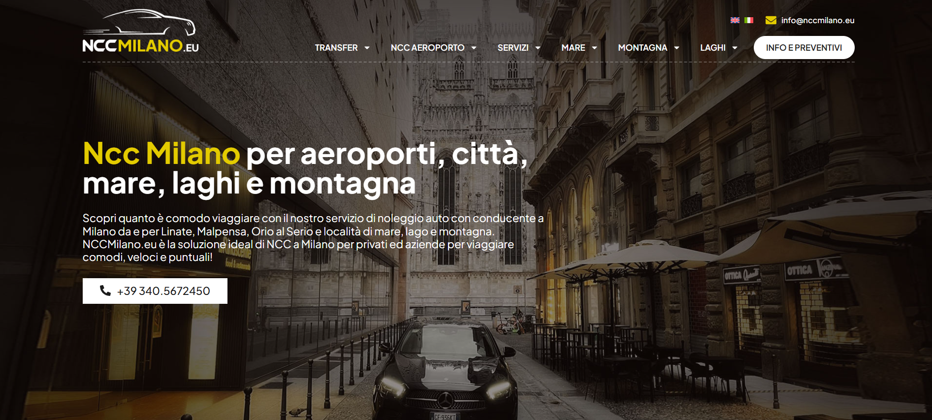 NCCMilano.eu è un sito web realizzato per un servizio NCC nel cuore di Milano, specializzato in transfer urbani, spostamenti da e per aeroporti, eventi aziendali e tour di rappresentanza.